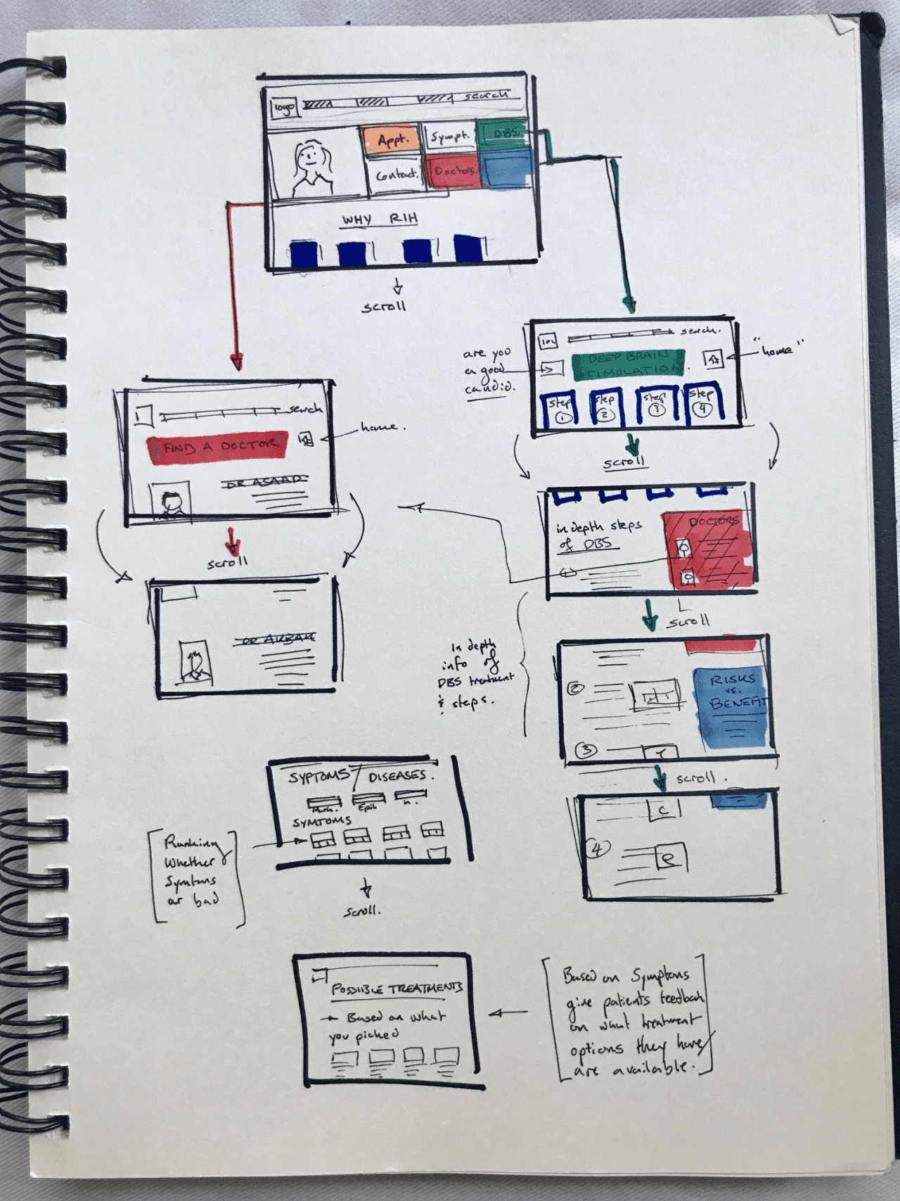 We first began our research by observing the neurosurgery team at Rhode Island Hospital, and figuring out which problems to solve in this space. From our initial observations, we noted that the cords in the operating room were messy, the surgical tools were difficult to locate, and maneuvering in the operating room was difficult and unsafe for everyone involved. We also conducted a contextual inquiry in the Fast Track clinic, in which patients undergo a series of tests to determine if DBS is right for them.