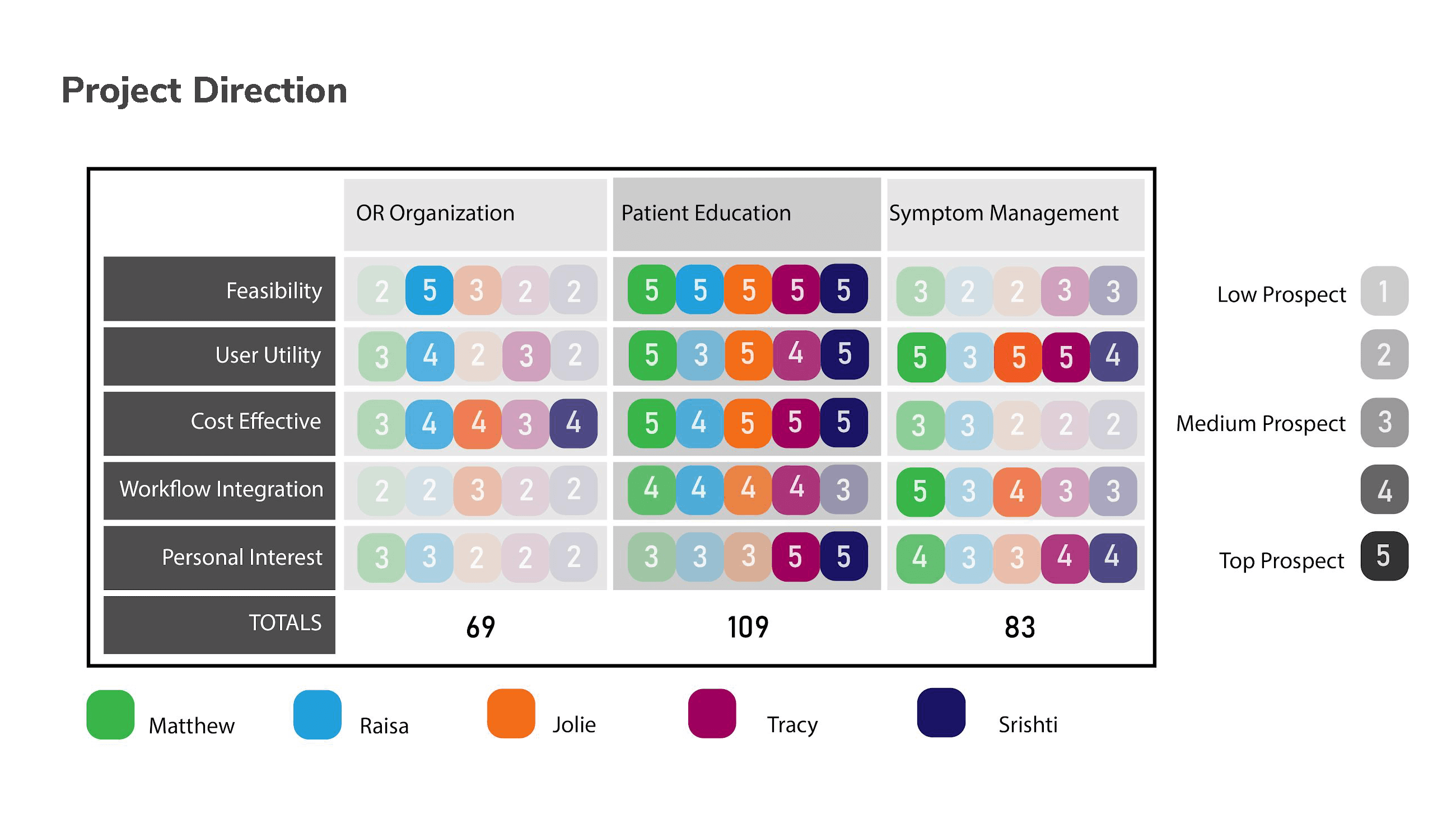 My team of five rated each idea, based on each of our perceptions on how promising each idea would be. We rated each idea through five criteria from low prospect to top prospect: